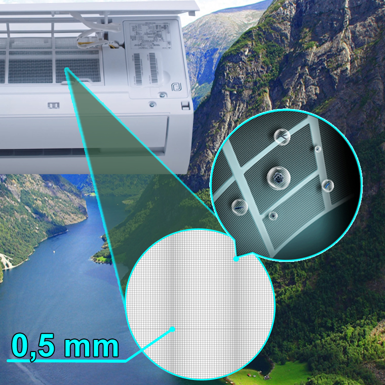 Внутренний и наружный теплообменники кондиционера покрыты специальным защитным слоем, который имеет водоотталкивающие свойства и защищает важные детали кондиционера от коррозии. Покрытие Gold Fin имеет более плотное расположение ионов, чем аналогичное Blue Fin, что обеспечивает более длительный срок службы теплообменника, и улучшенную защиту от воздействия окружающей среды.